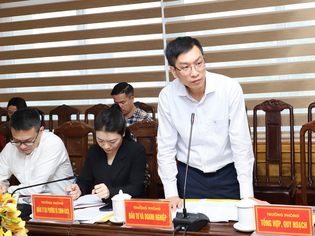 | Đại diện lãnh đạo các ngành tham gia ý kiến tại buổi làm việc. |