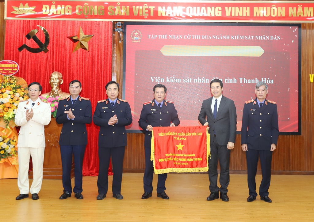 Nhân dịp này, thừa ủy quyền của Thủ tướng Chính phủ, đồng chí Hồ Đức Anh, Phó Bí thư Thường trực Đảng ủy, Phó Viện trưởng VKSND tối cao đã trao Cờ thi đua của Chính phủ tặng VKSND khu vực 1. Thừa ủy quyền của Viện trưởng VKSND tối cao, đồng chí Nguyễn Hồng Phong, Phó Bí thư Thường trực Tỉnh ủy đã trao Cờ thi đua của VKSND tối cao tặng VKSND tỉnh Thanh Hóa. Bốn đơn vị thuộc VKSND tỉnh nhận Cờ thi đua của VKSND tối cao.