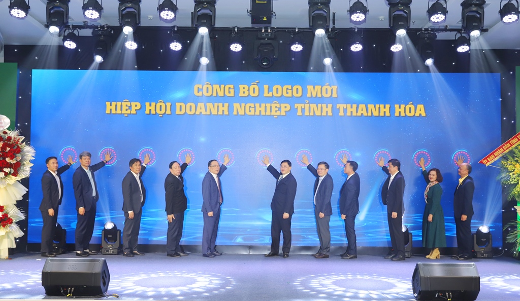 | Các đại biểu nhấn nút chính thức ra mắt logo mới của Hiệp hội Doanh nghiệp tỉnh Thanh Hóa. |